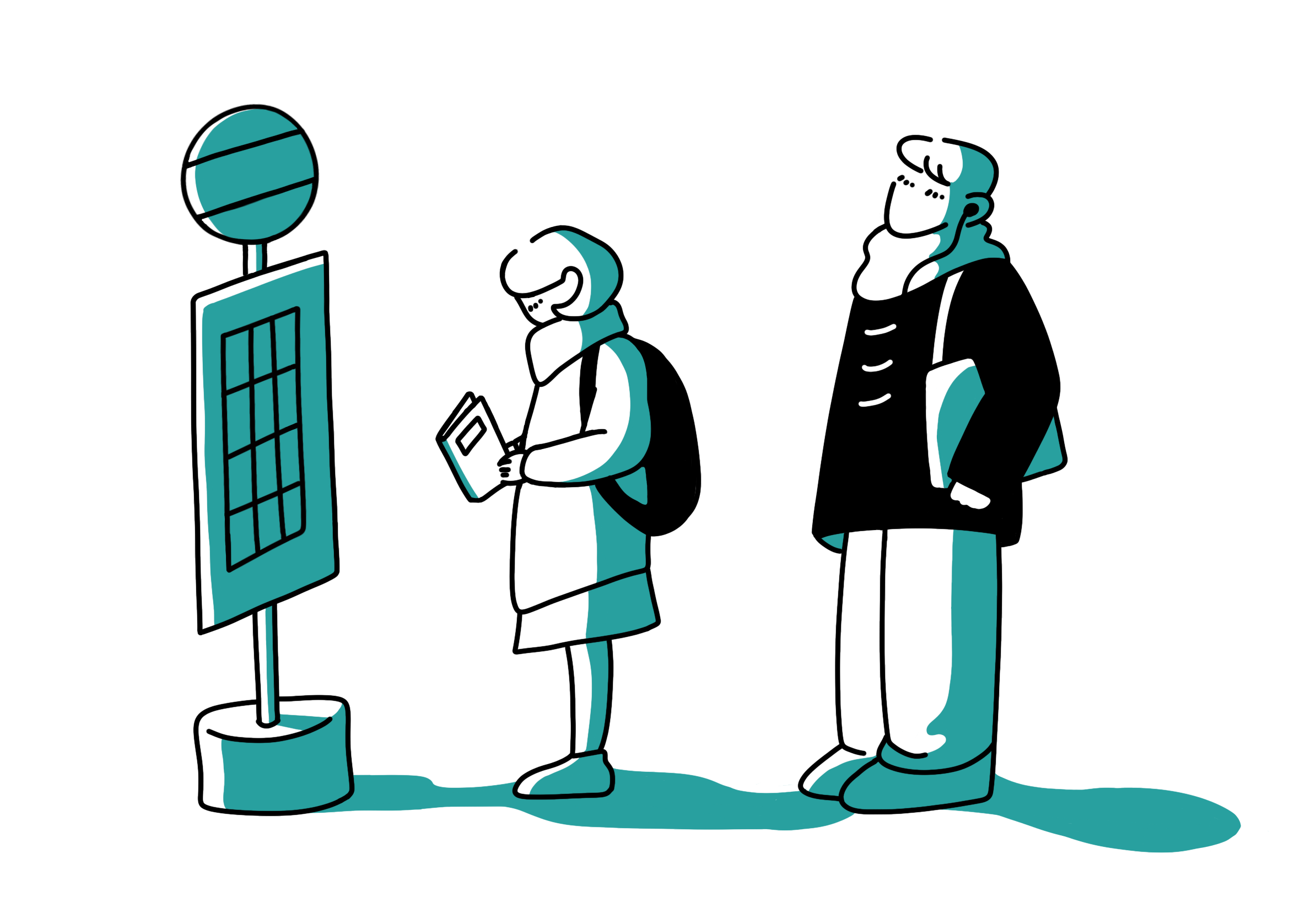夕暮れ時のバス停。学校帰り。学生が二名、山裾の住宅団地行きのバスを待っている。列先頭の女子学生は、テストが近いのだろう、参考書に一心に目を落としている。後ろの男子学生は、イヤホンをしながら、どこともなく視線を向けている。すっかり日も短くなった。