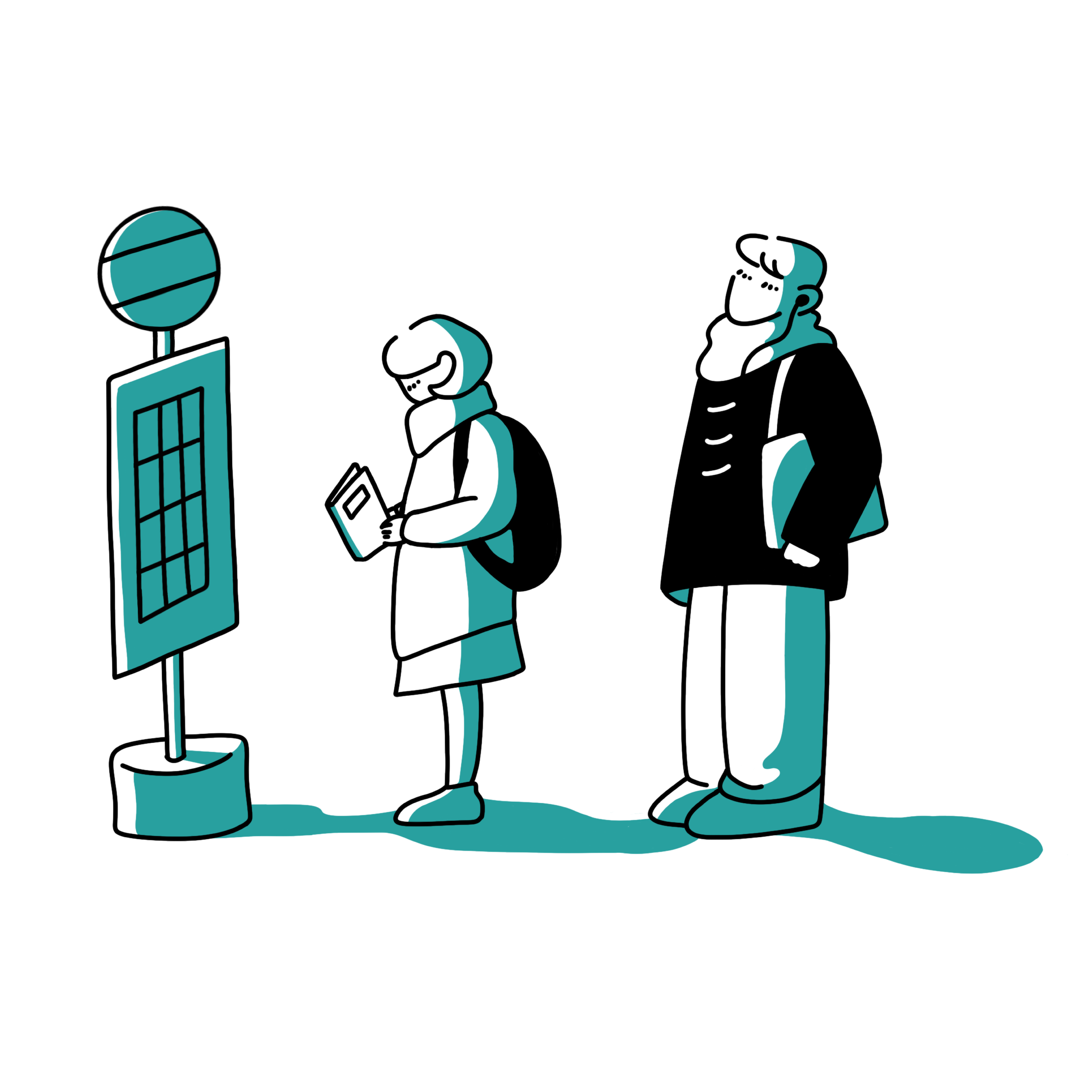 夕暮れ時のバス停。学校帰り。学生が二名、山裾の住宅団地行きのバスを待っている。列先頭の女子学生は、テストが近いのだろう、参考書に一心に目を落としている。後ろの男子学生は、イヤホンをしながら、どこともなく視線を向けている。すっかり日も短くなった。